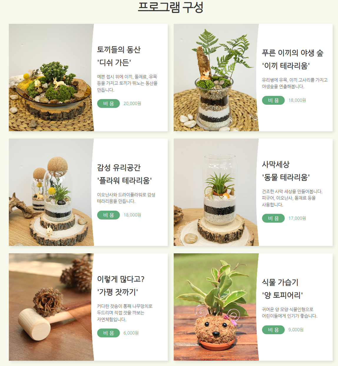 자연감성을 자극하는 가드닝 및 만들기 프로그램과 각종 정원 소품들을 판매합니다.